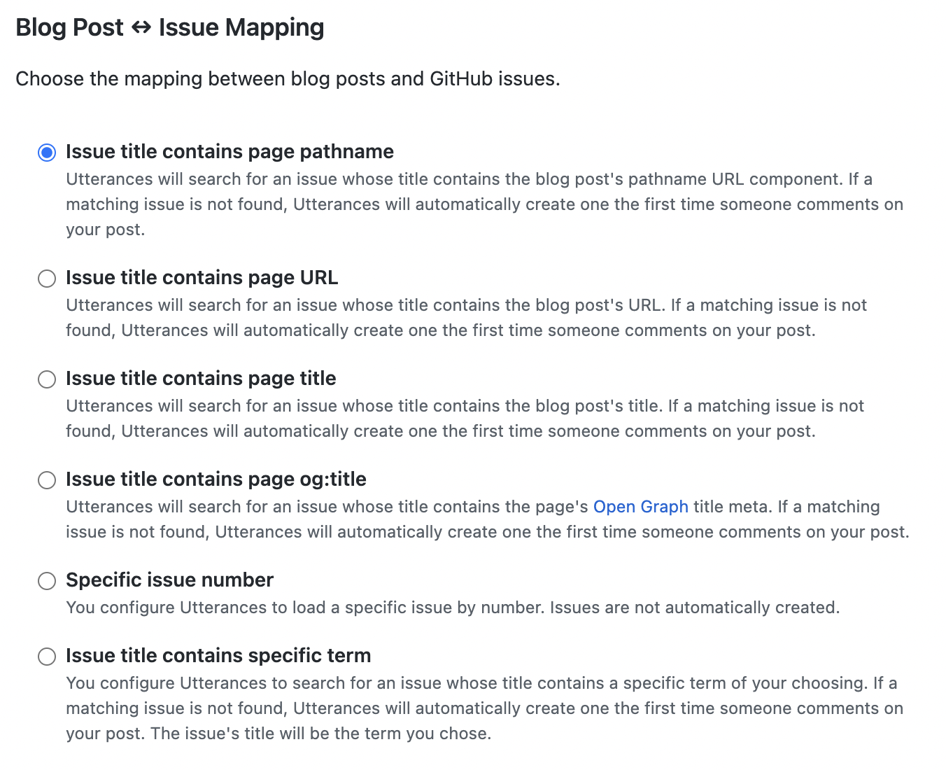 - Issue Mapping 방법 선택하기: 댓글이 어떻게 매핑될지 선택하세요. 일반적으로 pathname, url, title 등으로 설정할 수 있습니다. 저 같은 경우에는 가장 첫 번째인 pathname을 선택했습니다. 이 옵션은 각 블로그 포스트의 URL 경로를 기준으로 댓글이 매핑되므로 편리합니다.