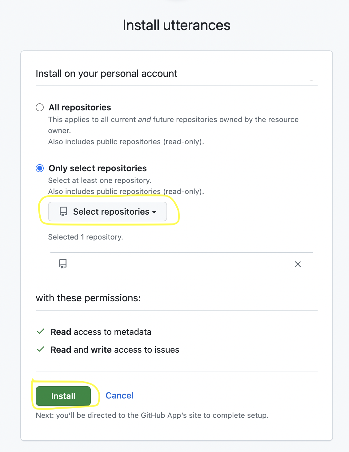 - Repository 선택: Utterances를 설치할 Repository를 선택하세요.