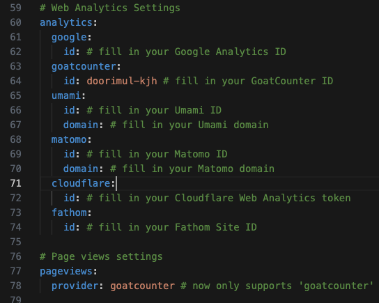 _config.yml또는 HTML 파일에서 GoatCounter 설정을 추가하세요._config.yml파일의 head 섹션에 다음과 같이 Tracking 코드를 추가하세요.