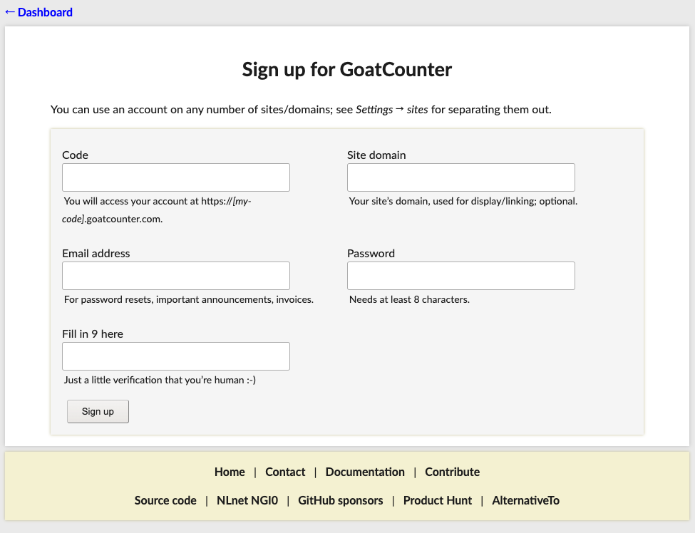 - GoatCounter 웹사이트로 이동: GoatCounter 공식 웹사이트에 접속하세요.